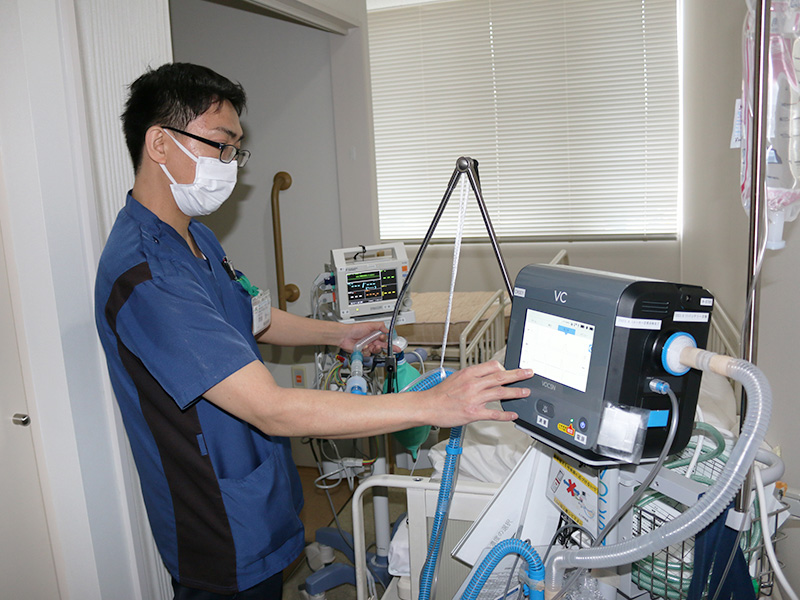 呼吸業務(人工呼吸器等)では咳をする力/肺の堅さ/酸素化能などを解析/聴診/調整し肺胞の詰まり/無気肺を予防、循環/代謝業務では透析業務/データ管理/定期点検/故障修理/各アフェレシス療法、機器管理業務では輸液機器や生体情報モニタなど各機器の法定点検や管理/機器説明会を行っています。